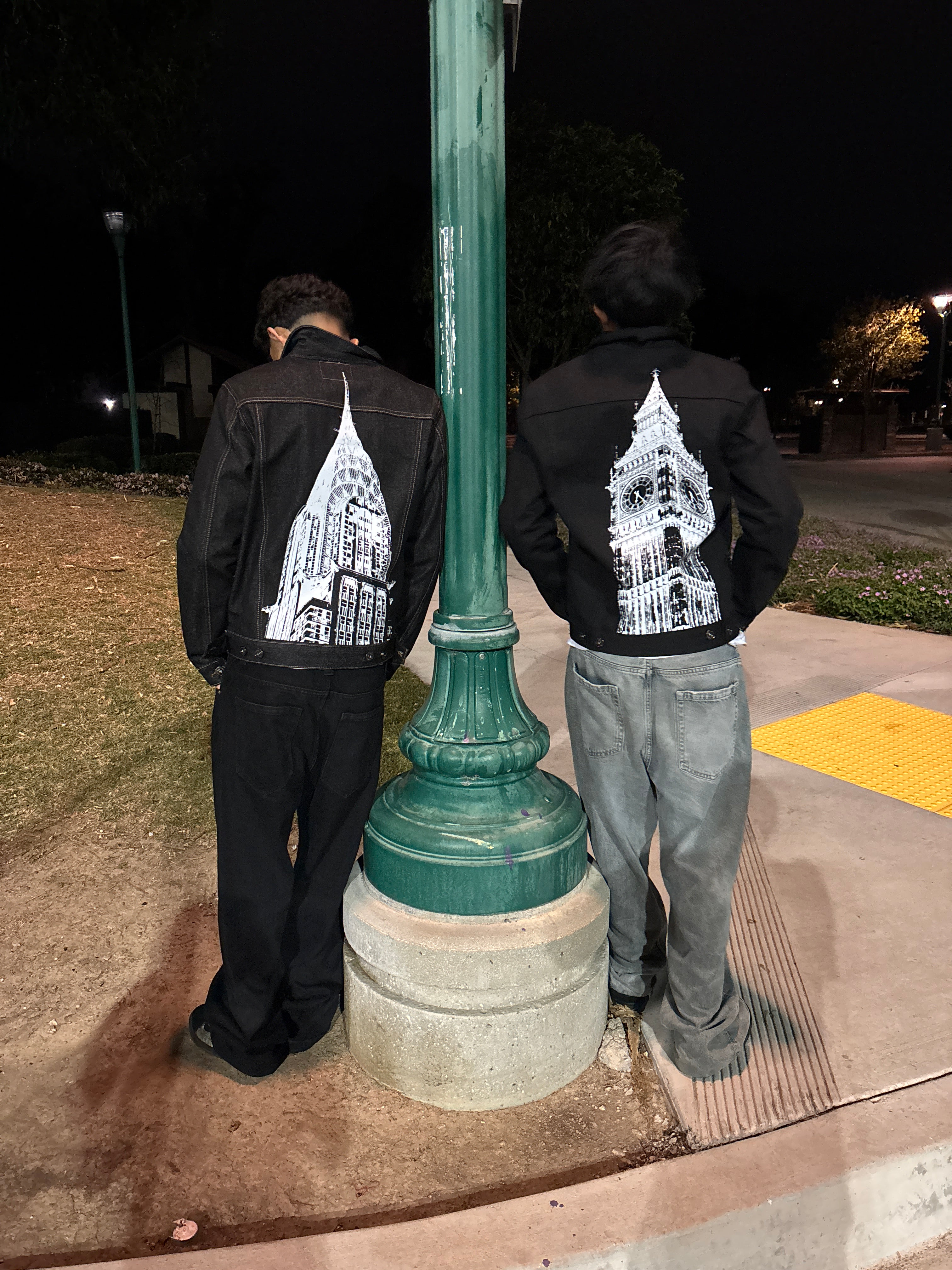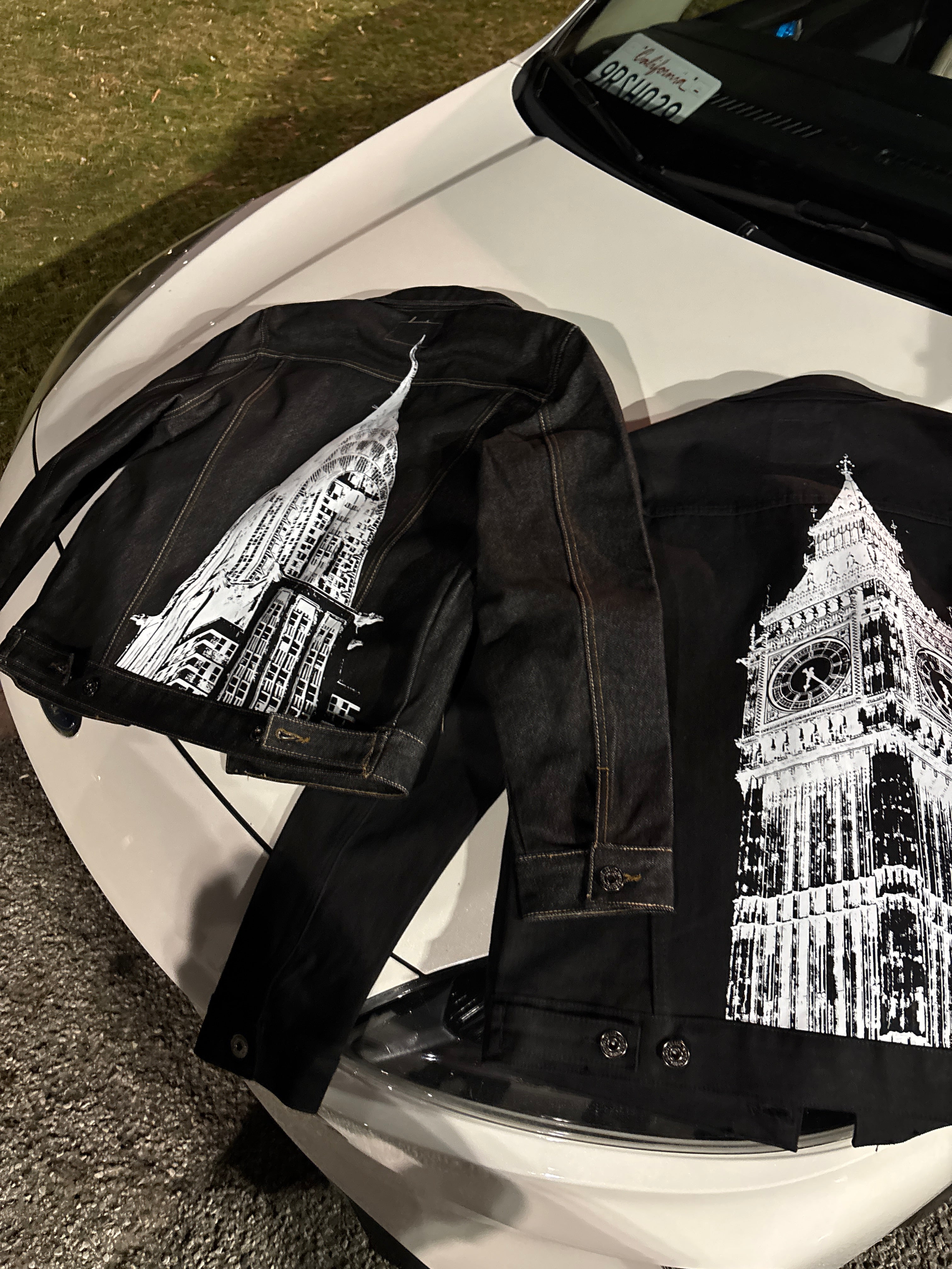 Looking to switch the designs on some of my pieces to different garment styles? Like getting the clock tower print on the lighter black jacket... Send me a message through the contact form below and lets get started with YOUR custom piece!
